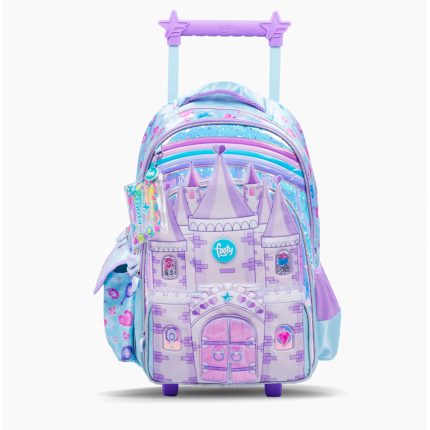 Mochila CARRO 18 Pulgadas 3 compartimientos principales + 1 Bolsillo frontal con aplique de castillo con puertas que se abren y 2 bolsillos laterales - uno de raso con tapa de holograma - y el otro con red reforzado abajo. Frente con aplique de castillo con puertitas que se abren con mooving patch, holograma con estrellas con arcoiris aplicado. Laterales de raso con estampa sublimada. Nuevo carro reforzado con 2 ruedas dobles de silicona (4 ruedas en total). Tiras de espalda reforzadas y manija de agarre ESTUCHE DE REGALO CON 5 MINI LAPICERAS DE COLORES