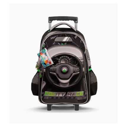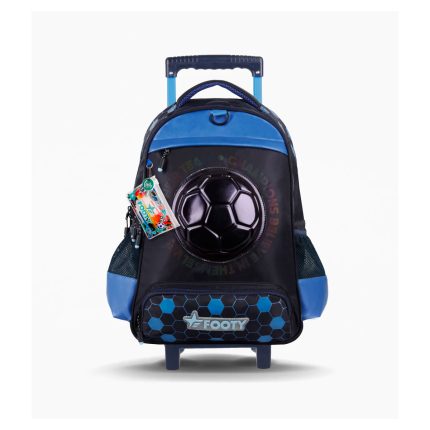 2 compartimientos principales grandes + 2 bolsillos frontales y 2 bolsillos laterales para botella de agua de red reforzados abajo en goma. Frente con pelota termoformada tornasolada, bolsillo inferior simil pelota de goma. Estampa con relieve y tira cierres especiales. Nuevo carro reforzado con 2 ruedas dobles de silicona (4 ruedas en total).