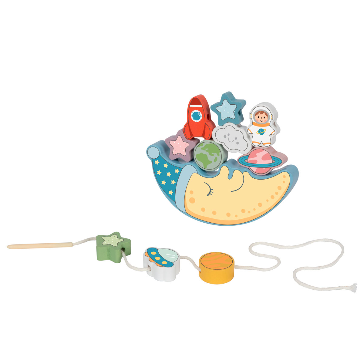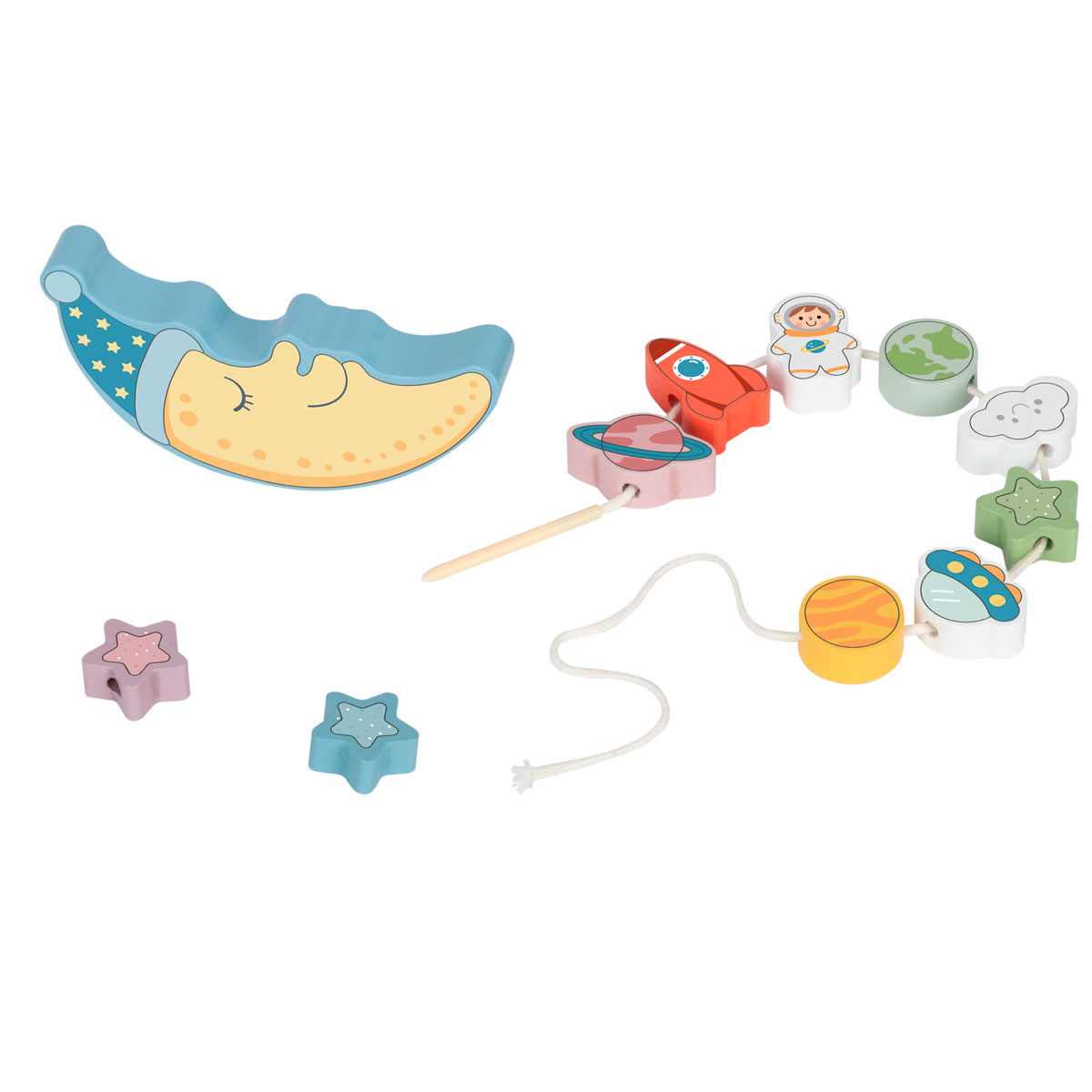 Cuando llega el momento de un nuevo reto, los bloques se transforman en una actividad de encaje con una aguja de madera y un cordón, lo que permite a los niños desarrollar aún más su motricidad fina enhebrando las cuentas. Pintado en tonos suaves con pintura no tóxica y segura para niños, y elaborado con madera con certificación FSC, este set es tan seguro como divertido.