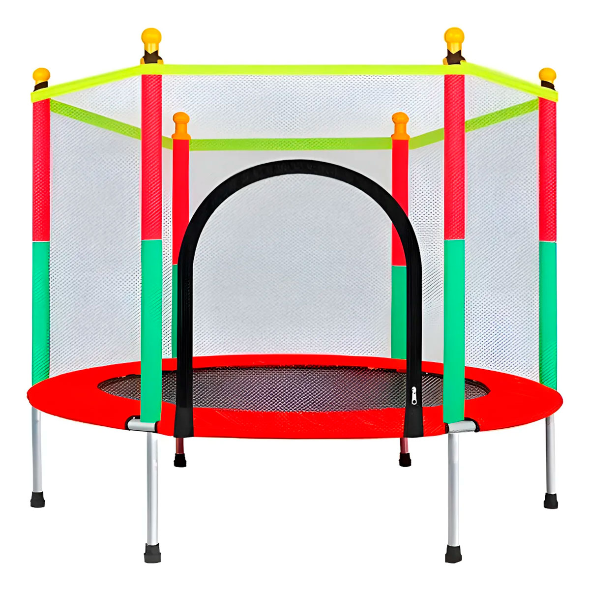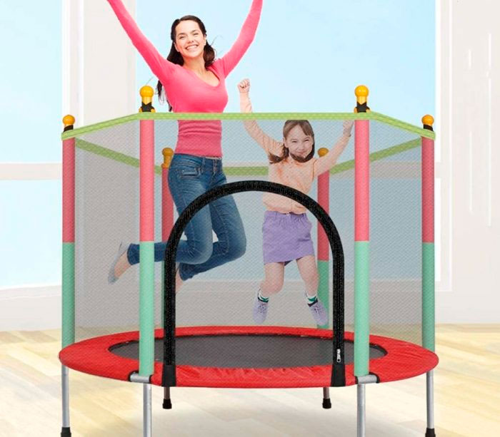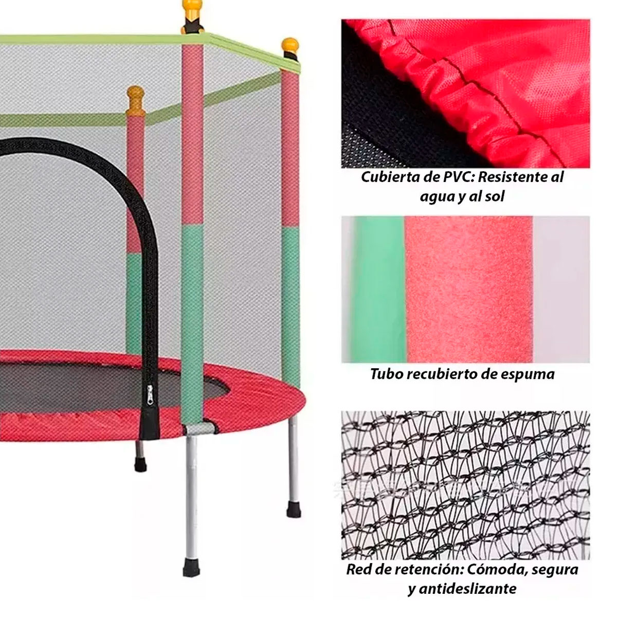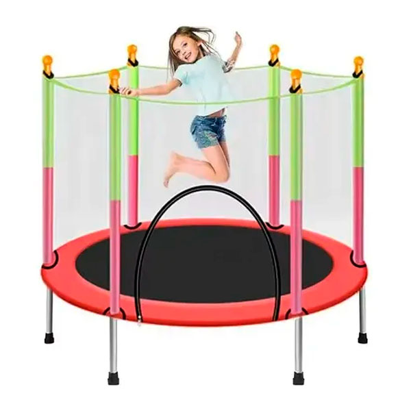 Cama elástica infantil para exterior e interior, con red de seguridad completa para evitar accidente. Estructura recubierta de espuma de poliuretano para proteger a los niños. El ejercicio que se realiza en esta cama elástica ayuda a quemar calorías y permite un adecuado desarrollo corporal de los pequeños.