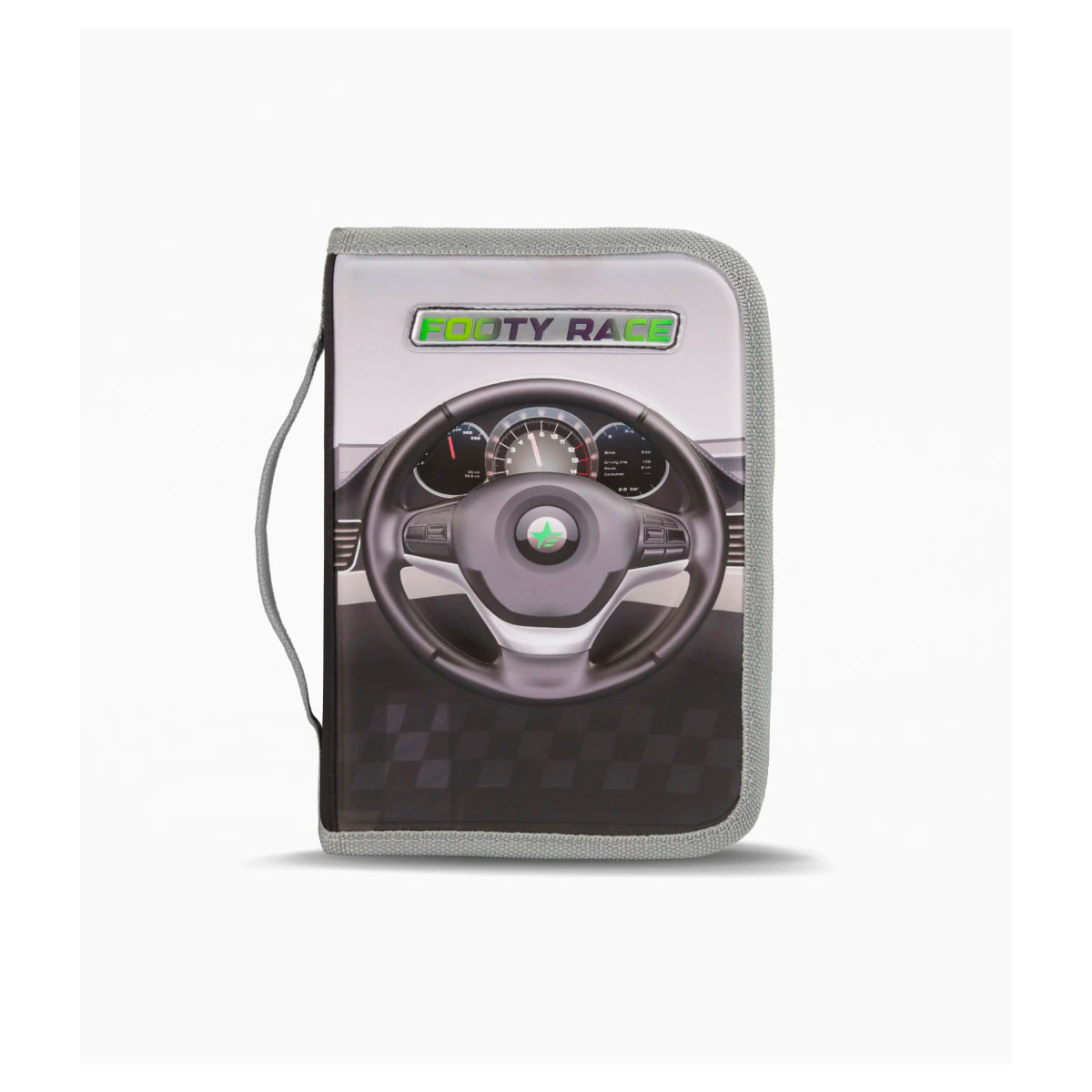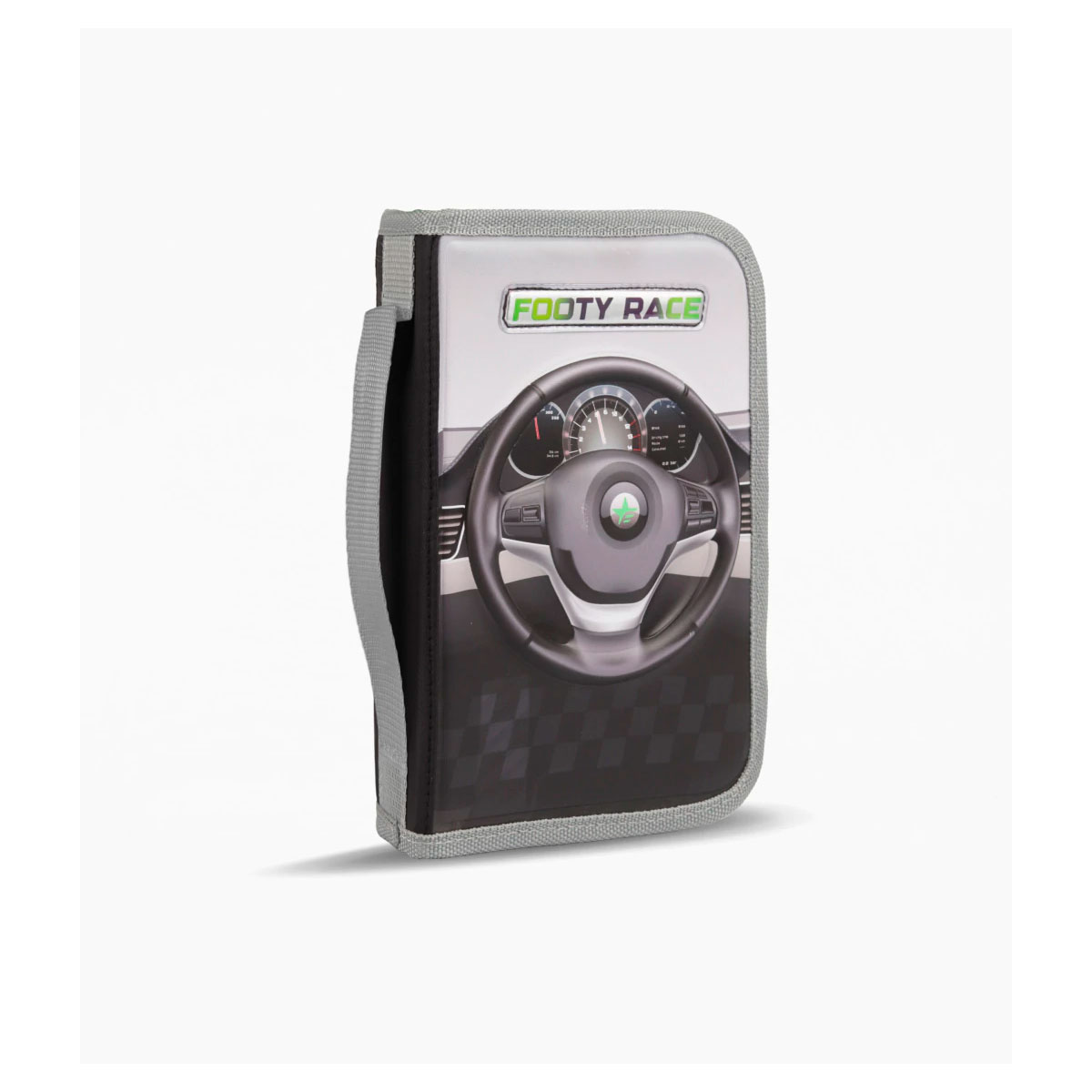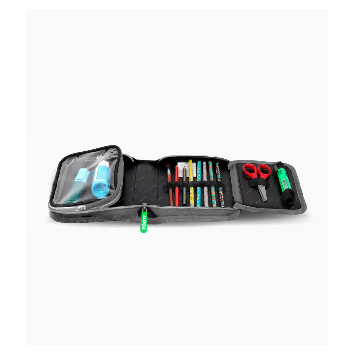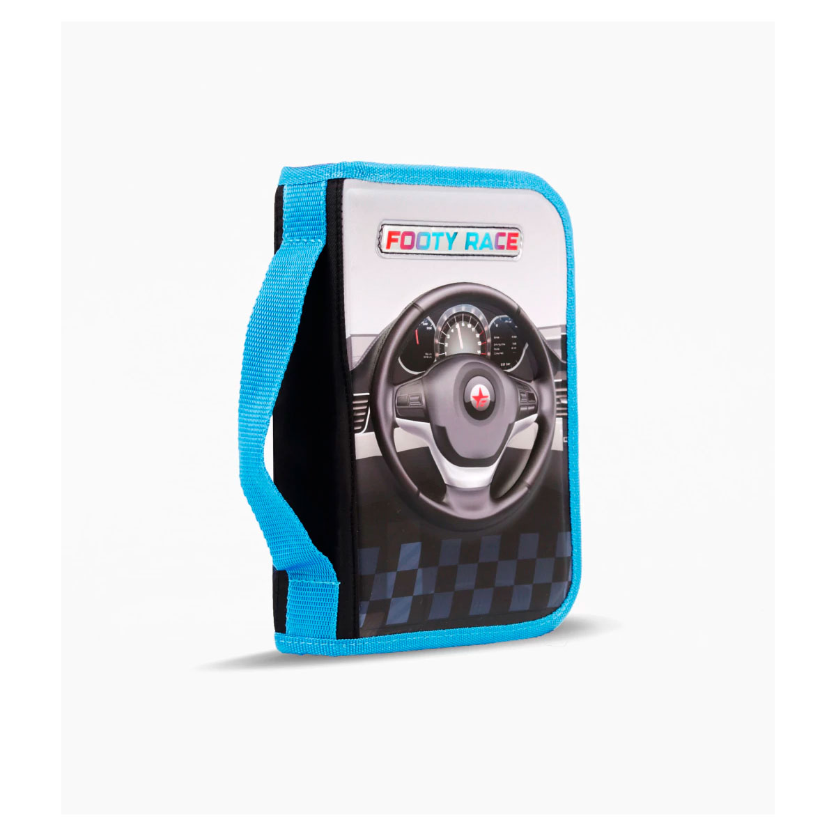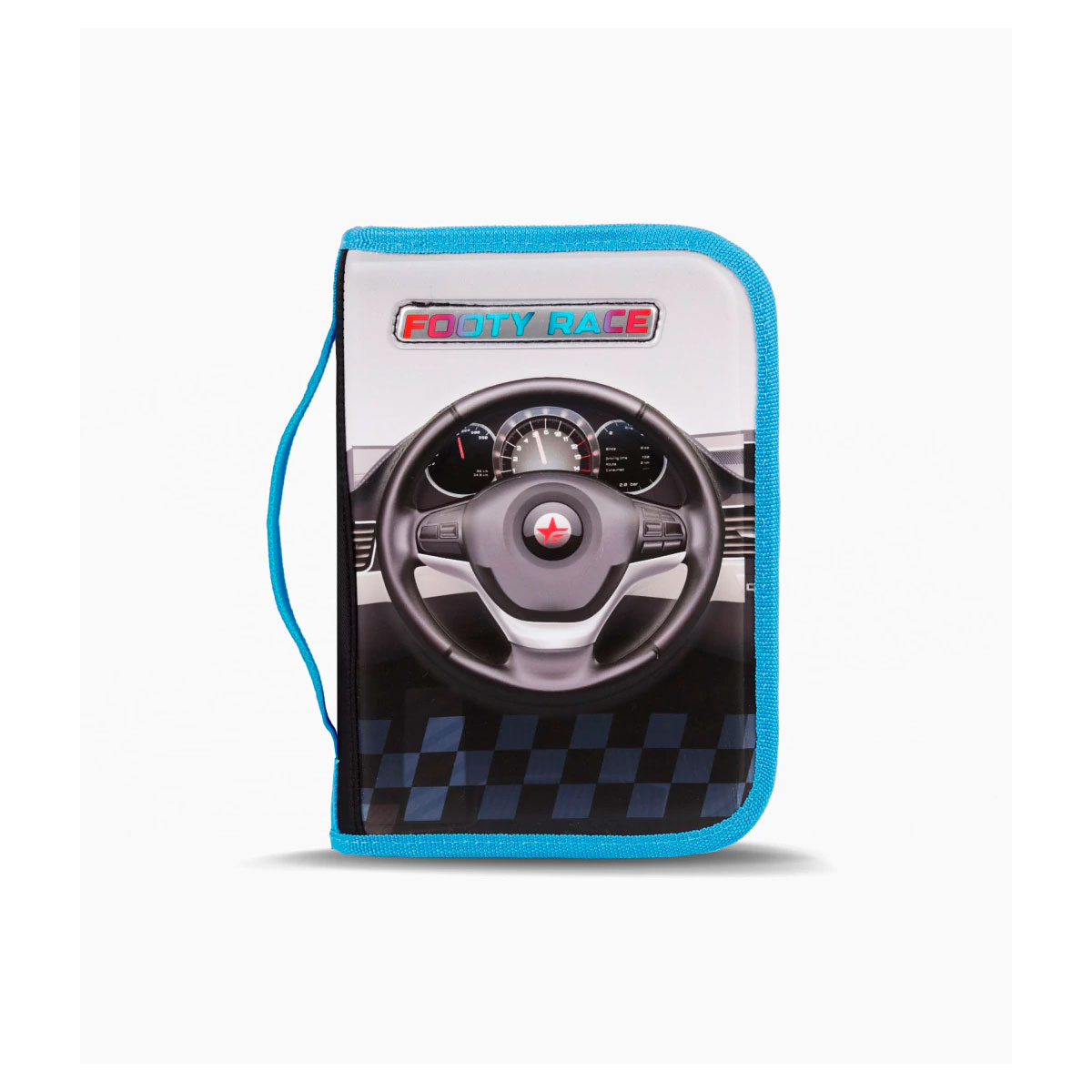 Bolsillo interno transparente, interior estampado con logos de Footy, elasticos para utiles.
