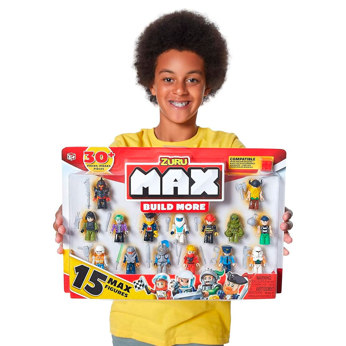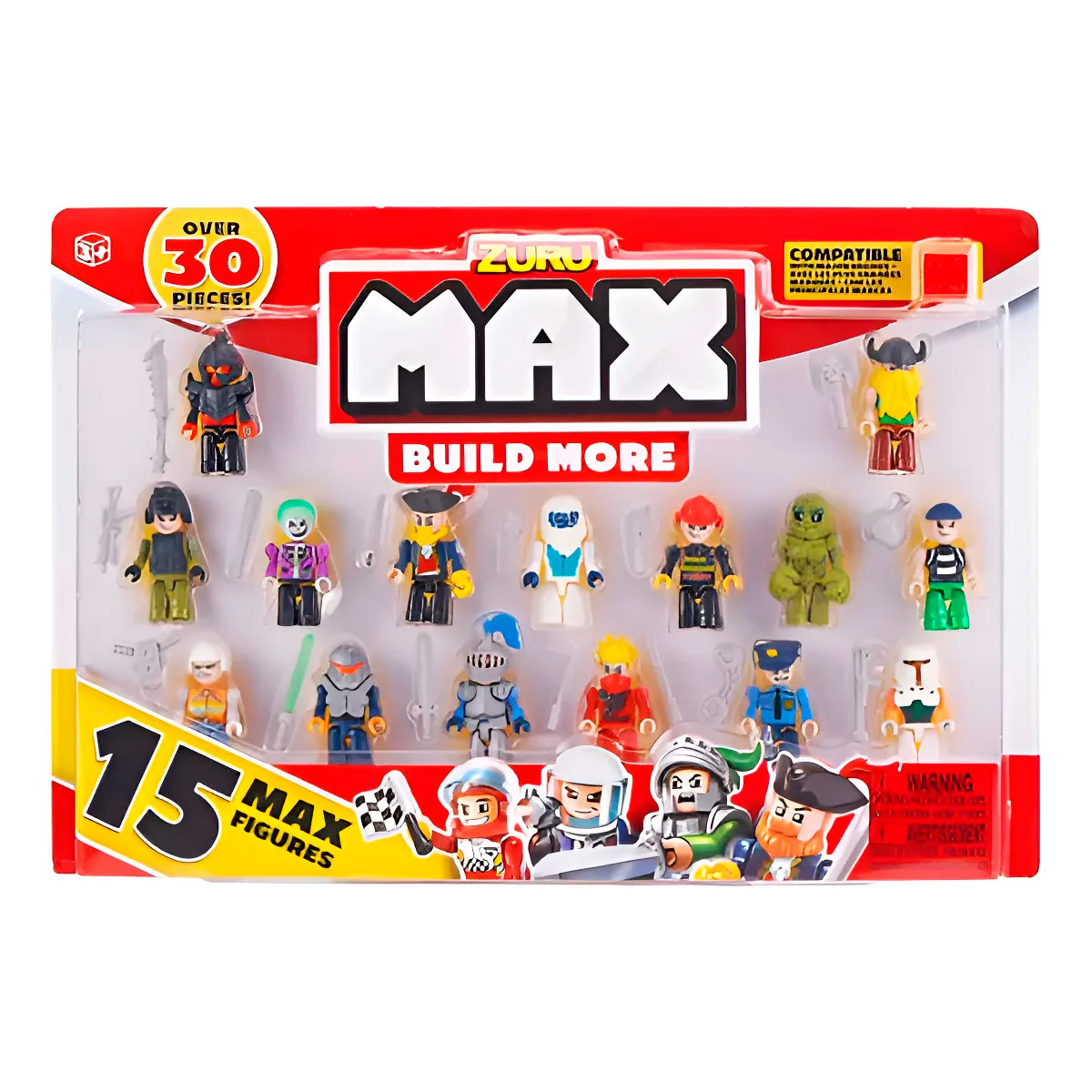 EL PAQUETE INCLUYE: 15 figuras exclusivas de ZURU MAX Build More con piezas intercambiables; 15x armas o herramientas apropiadas para cada personaje; 15x sombrero, casco o postizos.