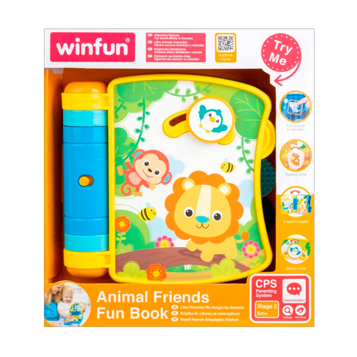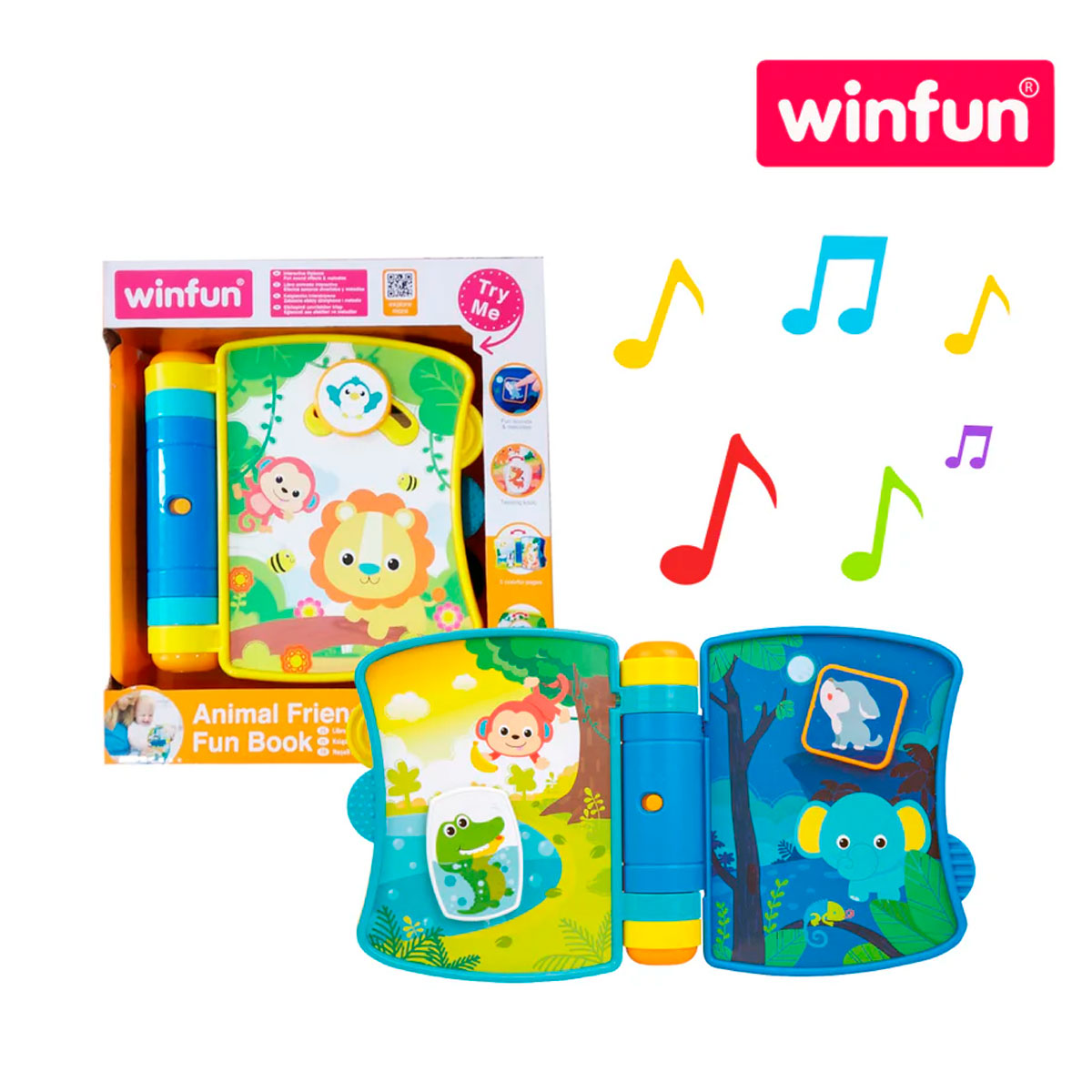 - Tiene 3 páginas ilustradas por ambos lados con simpáticos animales y botones para presionar, rotar y mover.