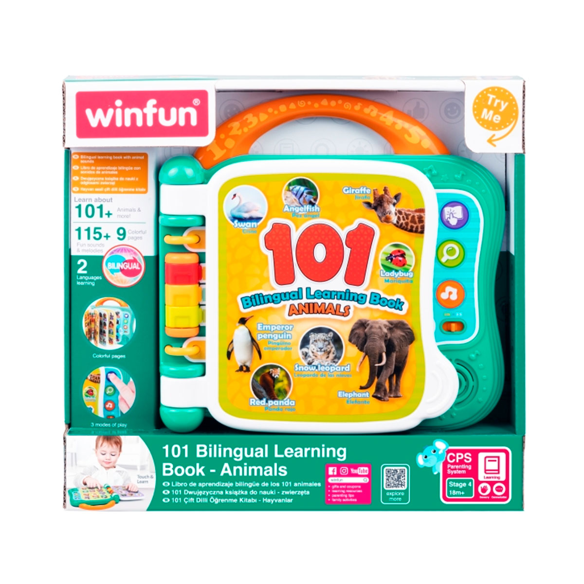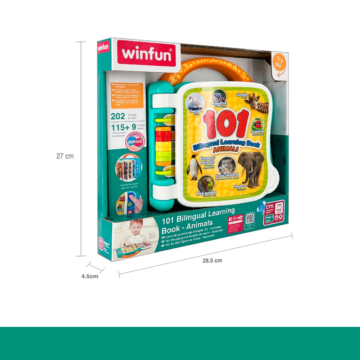 Libro de aprendizaje interactivo y bilingüe que enseña 101 animales en dos idiomas.