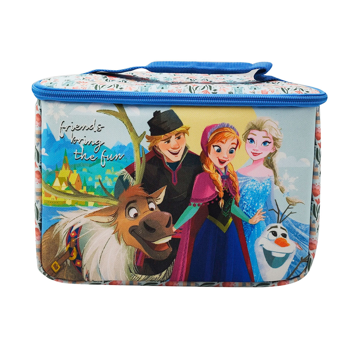 Lunchera infantil con diseño de Frozen en color celeste o salmón con estampado de los personajes. Es térmica por lo que conserva tanto los alimentos fríos como caliente, tiene un aislante que recubre todo su interior de aluminio. Se abre con un cierre de doble carril y tiene una abertura completa.