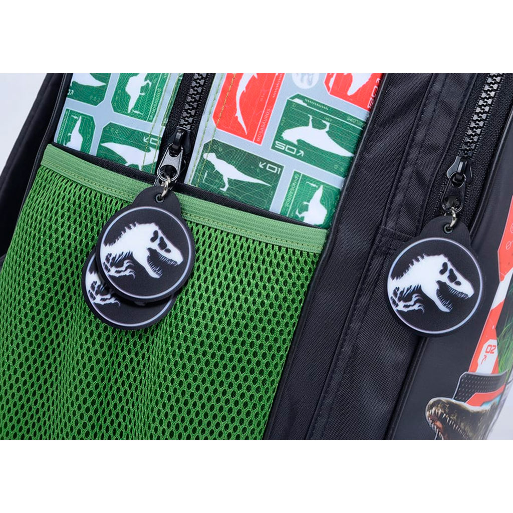 Mochila infantil con diseño de Jurassic Wold, mide 37 cm x 29 cm x 16 cm profundidad. El diseño es verde oscuro y claro, con estampado de dinosaurios adelante. Tiene 2 lazos para colgar ajustables, con grosor dando firmeza en la carga de la mochila y más comodidad para usarla. Es una mochila con carro y asas por lo que se puede llevar con las rueditas o en la espalda.