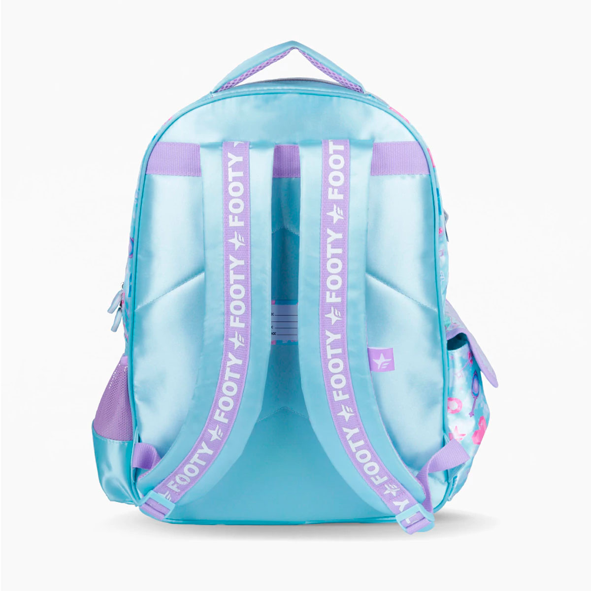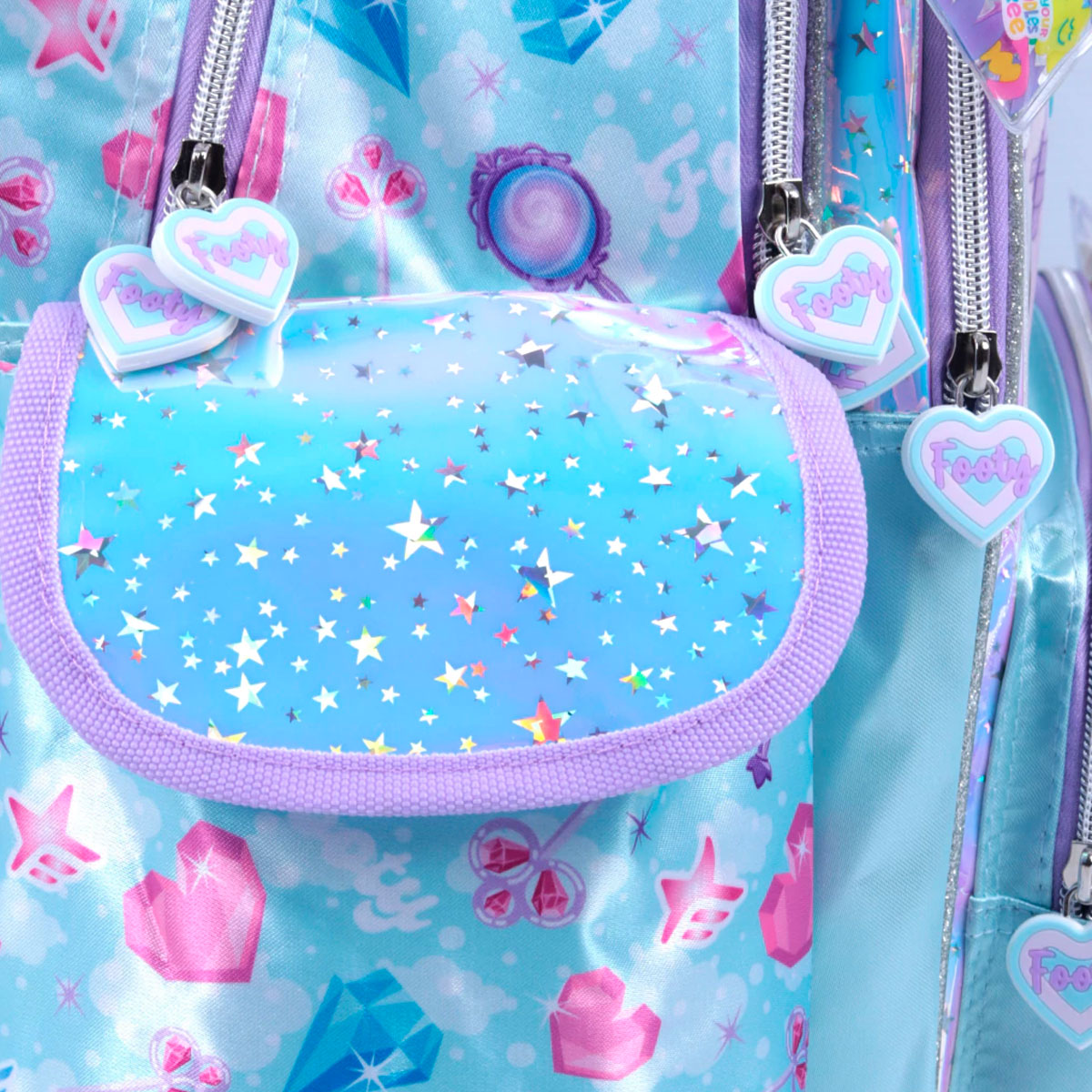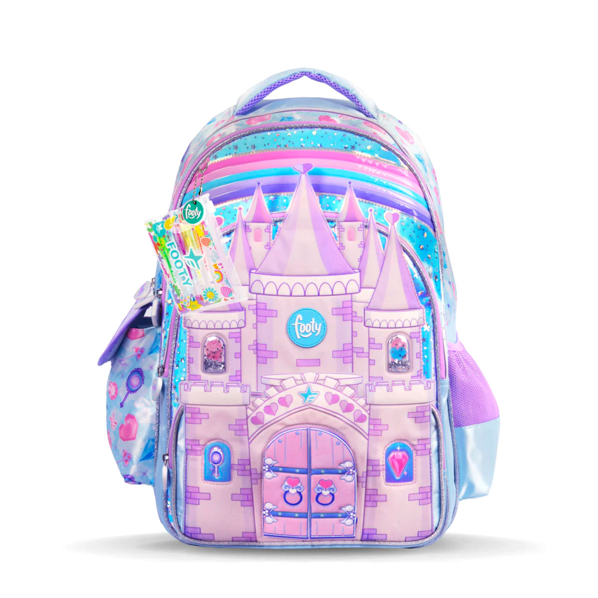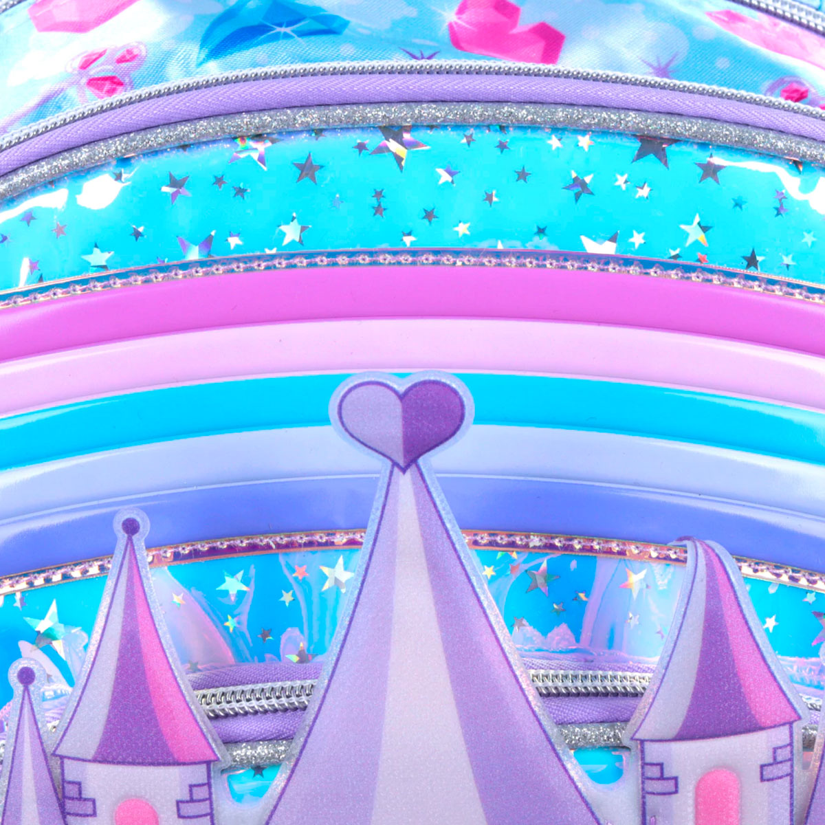 3 compartimientos principales + 1 Bolsillo frontal con aplique de castillo con puertas que se abren y 2 bolsillos laterales – uno de raso con tapa de holograma – y el otro con red reforzado abajo. Frente con aplique de castillo con puertitas que se abren con mooving patch, holograma con estrellas con arcoiris aplicado. Laterales de raso con estampa sublimada. Tiras de espalda reforzadas y manija de agarre. ESTUCHE DE REGALO CON 5 MINI LAPICERAS DE COLORES