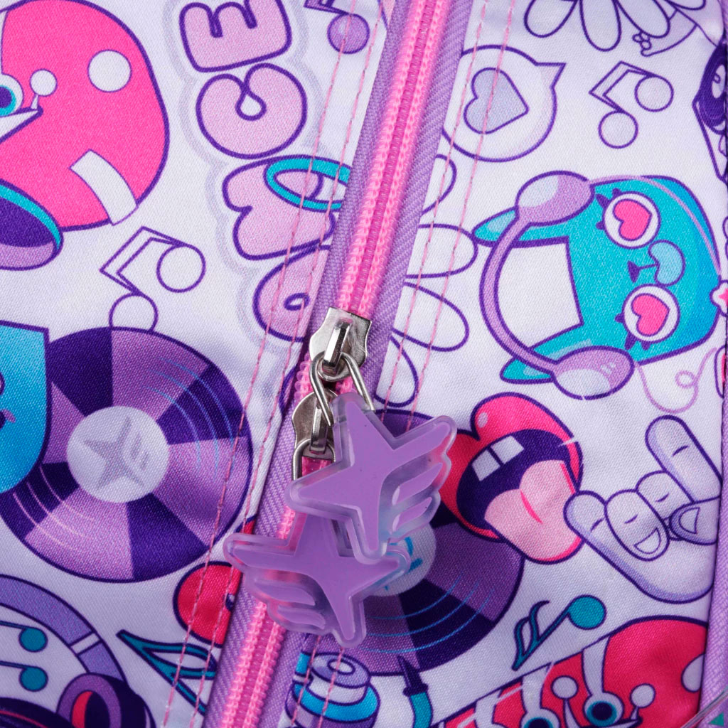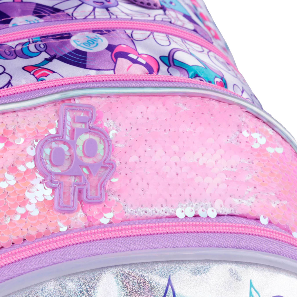 Bolsillo frontal con piano de rubber con sonido de las notas musicales. Luz led a pila intercambiable. Tela de raso estampada y lentejuelas reversibles.