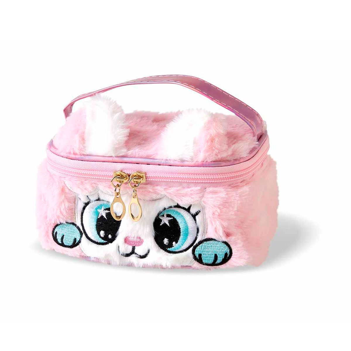 Un set de belleza en un encantador neceser es el sueño de toda pequeña amante del maquillaje y la belleza. Este neceser, hecho de suave felpa en un tono rosa pastel con un estampado de gato, es un lugar práctico y mágico para guardar cosméticos.