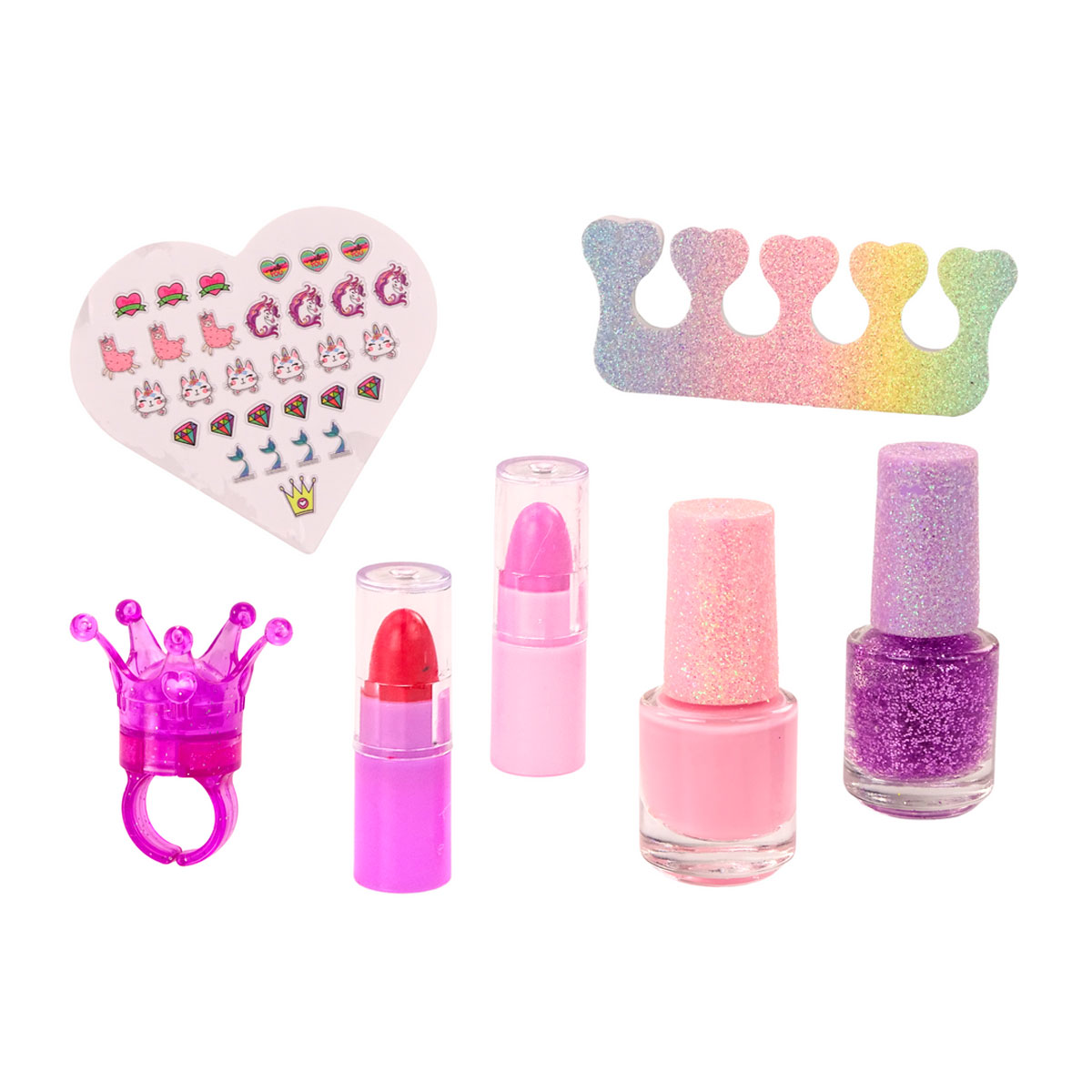 El interior del neceser contiene auténticos tesoros para cada pequeña. Dos esmaltes de uñas, un separador, pegatinas para uñas, un pincel para aplicar sombras, dos labiales pequeños y un precioso anillo de brillo labial con forma de corona: todo esto crea un set completo para divertirse con el estilo.