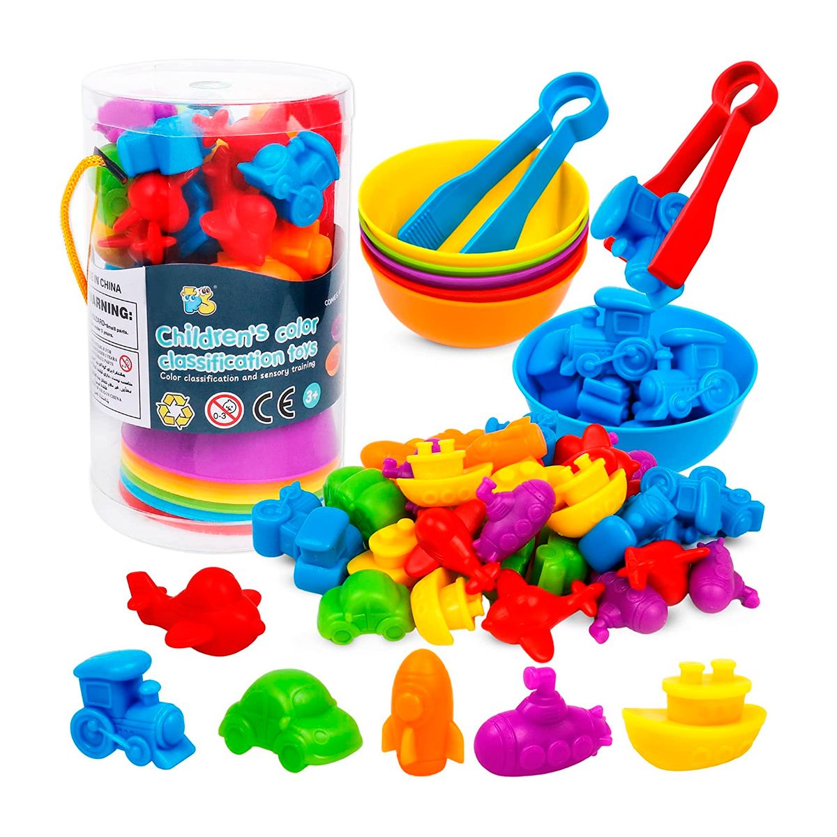 Los juguetes clasificadores de vehículos de conteo arcoíris son ideales para ayudar a los niños a construir la relación entre la mente y la mano. Contiene vehículos y cuencos de diferentes colores, y dos pinzas grandes, las pinzas grandes proporcionan diversión extra para los niños, practican agarre, recoger y liberar a través de juegos, mejor ejercitar la coordinación ojo-mano de los niños, también es una gran herramienta para aprender la clasificación de color, contar habilidades motoras finas y combinaciones.