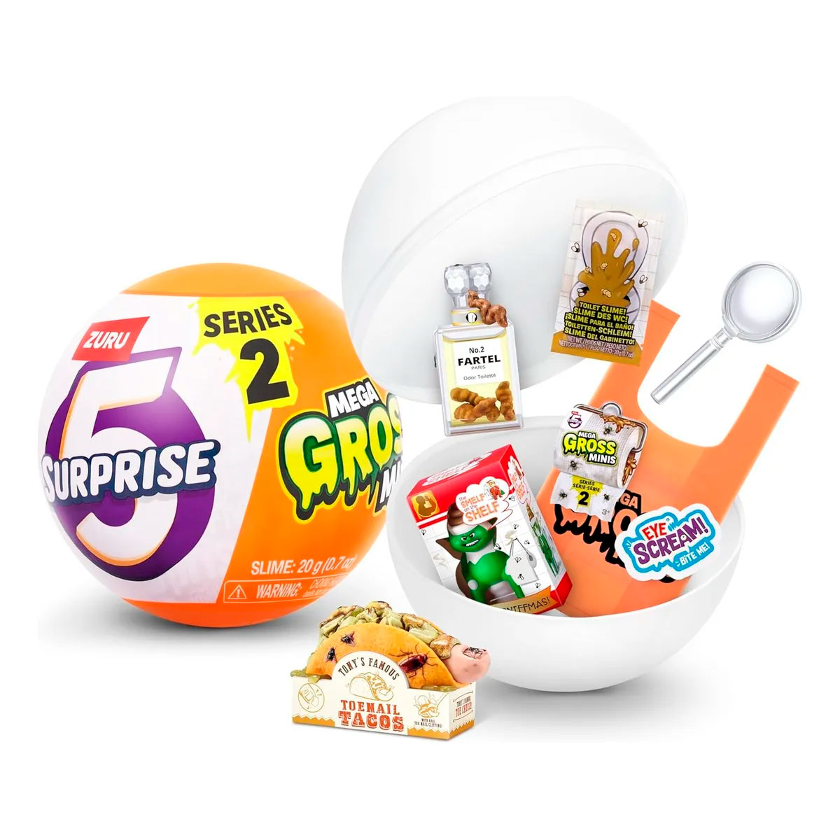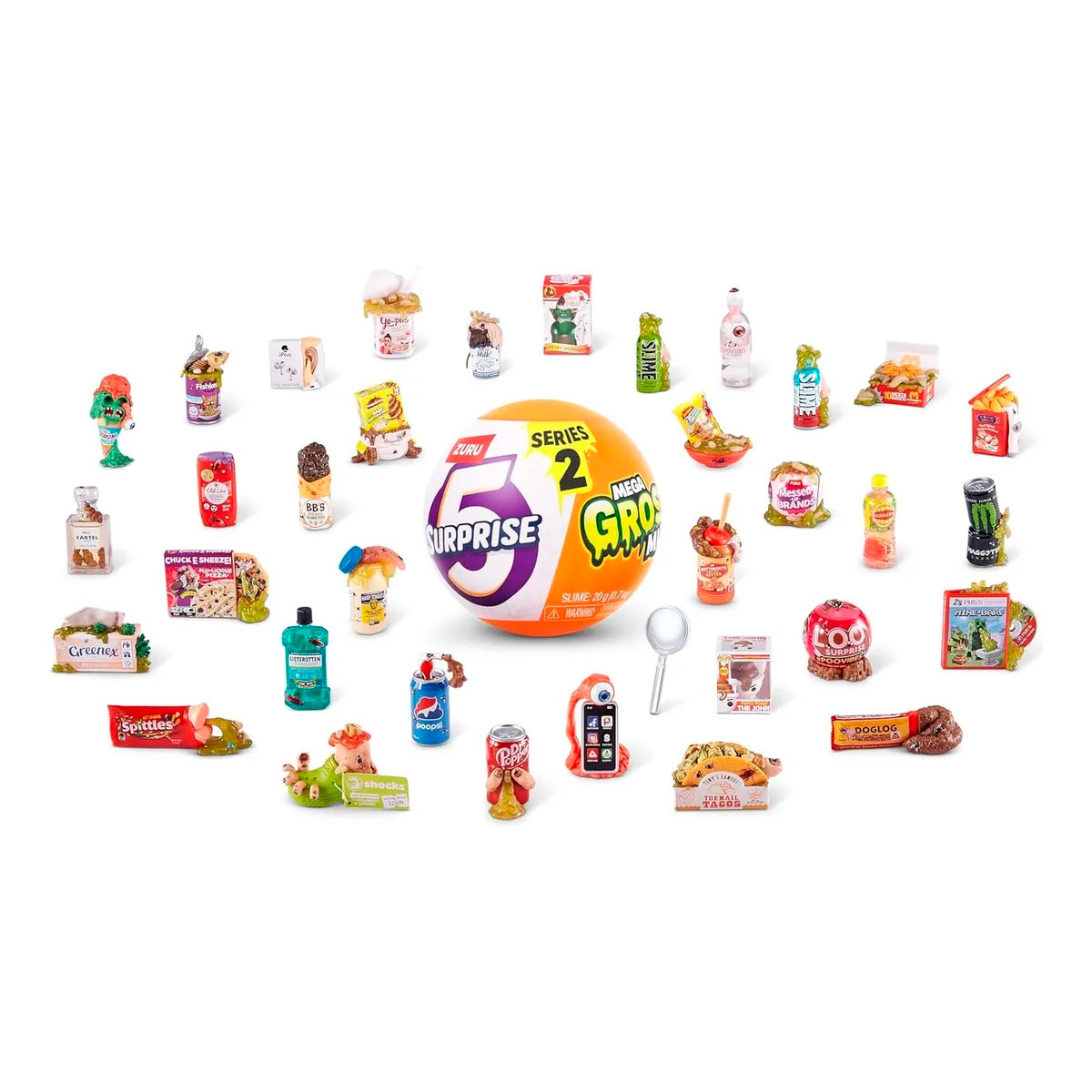 Mega Gross Minis 5 Surprises adentro: Pelar y revelar esta cápsula crujiente para descubrir 5 sorpresas brutas! Cada cápsula tiene capacidad para 3 Mega Gross Minis, bolsa de inodoro Slime, calcomanía y guía de coleccionistas.