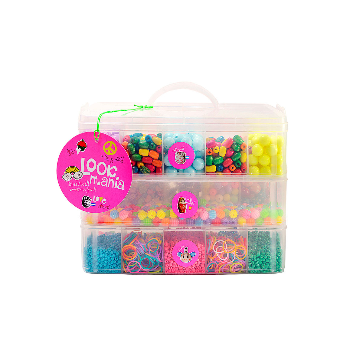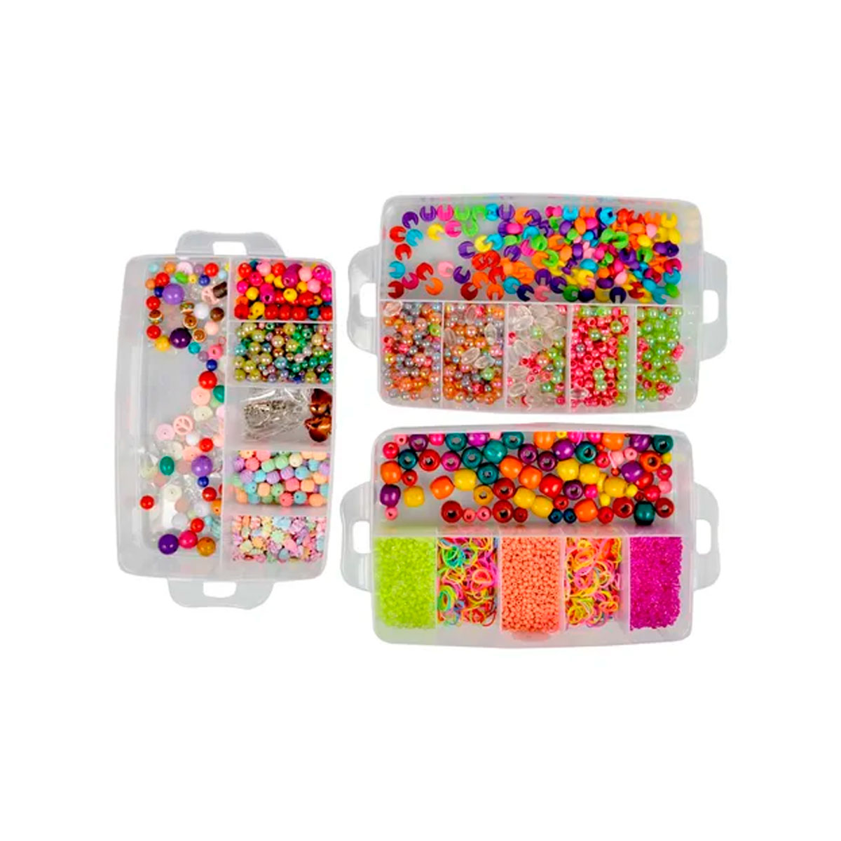 La versión grande de esta valija de 3 pisos está pensada para quienes quieren llevar la creatividad al siguiente nivel. Con una mayor cantidad de cuentas, dijes, hilos elásticos y accesorios decorativos, ofrece infinitas combinaciones para diseñar pulseras, collares, tobilleras y mucho más.